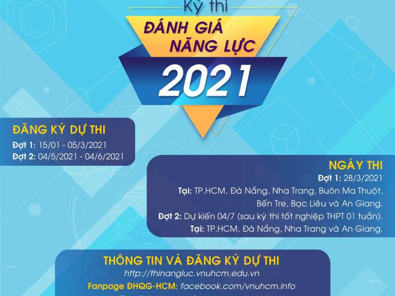 Thời gian đăng ký dự thi kỳ thi ĐGNL sẽ diễn ra từ ngày 2 - 30/5 theo cách trực tuyến, đường bưu điện hoặc trực tiếp tại ĐHQG-HCM. Lệ phí thi là 200.000 đồng/thí sinh. Kỳ thi diễn ra ngày 7/7 tại 3 điểm thi là TP.HCM, Cần Thơ, Quy Nhơn và công bố kết quả thi vào ngày 15/7.