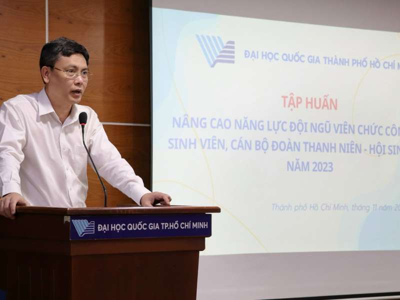 Đó là chỉ đạo của PGS.TS Nguyễn Minh Tâm - Phó Giám đốc ĐHQG-HCM, tại Chương trình Nâng cao năng lực cho đội ngũ viên chức công tác sinh viên, cán bộ Đoàn Thanh niên - Hội Sinh viên năm 2023, được tổ chức tại Nhà Điều hành ĐHQG-HCM vào sáng 29/11. Chương trình thu hút hơn 150 viên chức, cán bộ Đoàn - Hội trong hệ thống ĐHQG-HCM tham dự. -
