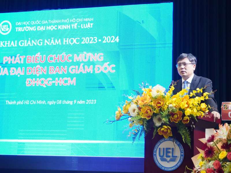 Sáng 8/9, Trường ĐH Kinh tế - Luật tổ chức Lễ khai giảng năm học 2023-2024, đón nhận 2.500 tân sinh viên. PGS.TS Nguyễn Minh Tâm - Phó Giám đốc ĐHQG-HCM, đã đến dự. -