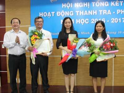 Chủ tọa chương trình hội thảo. Từ trái sang: PGS. TS Đỗ Hạnh Nga - Nguyên Trưởng khoa Khoa CTXH, Trường ĐH KHXH&NV, ông Tô Đức - phó cục trưởng Cục Bảo trợ xã hội,  Bộ Lao động - Thương binh và Xã hội và TS Lê Hữu Phước - Phó Hiệu trưởng Trường ĐH KHXH&NV ĐHQG-HCM.