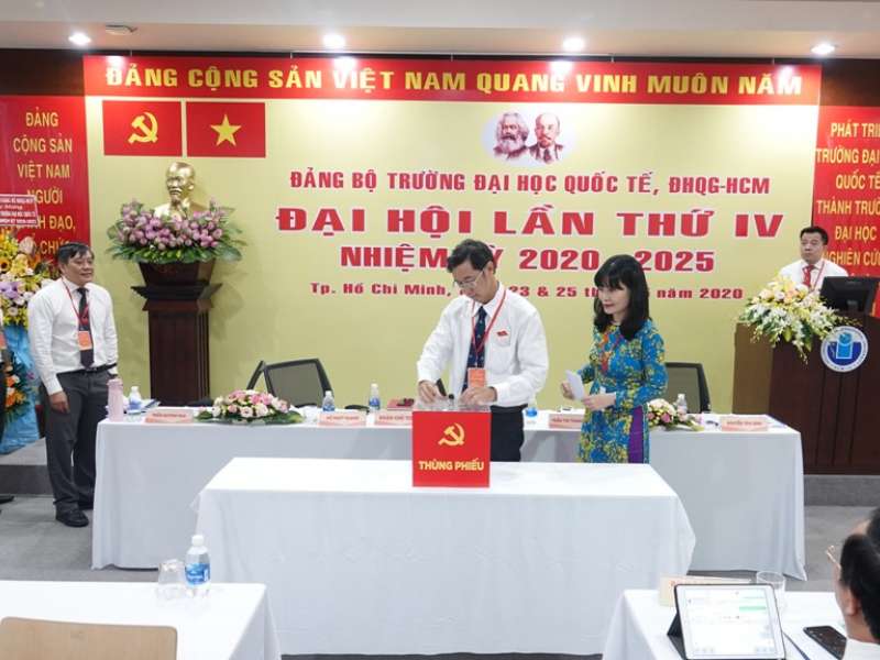 Ngày 25/5, Trường ĐH Quốc Tế ĐHQG-HCM đã tổ chức Đại hội Đảng bộ lần thứ IV, nhiệm kỳ 2020-2025 với sự tham dự của 99 đại biểu đại diện cho các chi bộ ở các khoa, bộ môn, phòng, ban của nhà trường. PGS.TS Huỳnh Thành Đạt, Bí thư Đảng ủy, Giám đốc ĐHQG-HCM đã đến dự và phát biểu chỉ đạo. -
