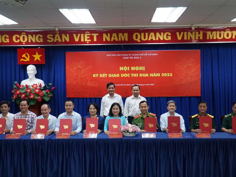 Sáng 8/3, tại TP.HCM, 10 đơn vị của Ban Dân vận Thành ủy TP.HCM đã ký kết giao ước thi đua năm 2023. Ông Ngô Văn Luận - Phó Trưởng Ban Dân vận Thành ủy, và PGS.TS Vũ Hải Quân - Ủy viên BCH Trung ương Đảng, Giám đốc ĐHQG-HCM, đã đến dự. -